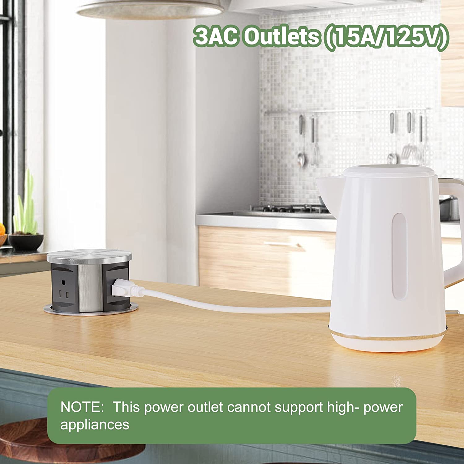 - [ PLEASE NOTICE ITEM SIZE ] : Please cautious on item size the item might large than your expect. 3 AC Outlet (15A/125V) & 2 USB Ports (5V/3.1A) , 6FT Cable. Perfect for kitchen island, adds outlets right where you need them. Great to charge blender, juicer, crock pot etc. NOTE: This power outlet cannot support high- power appliances.
