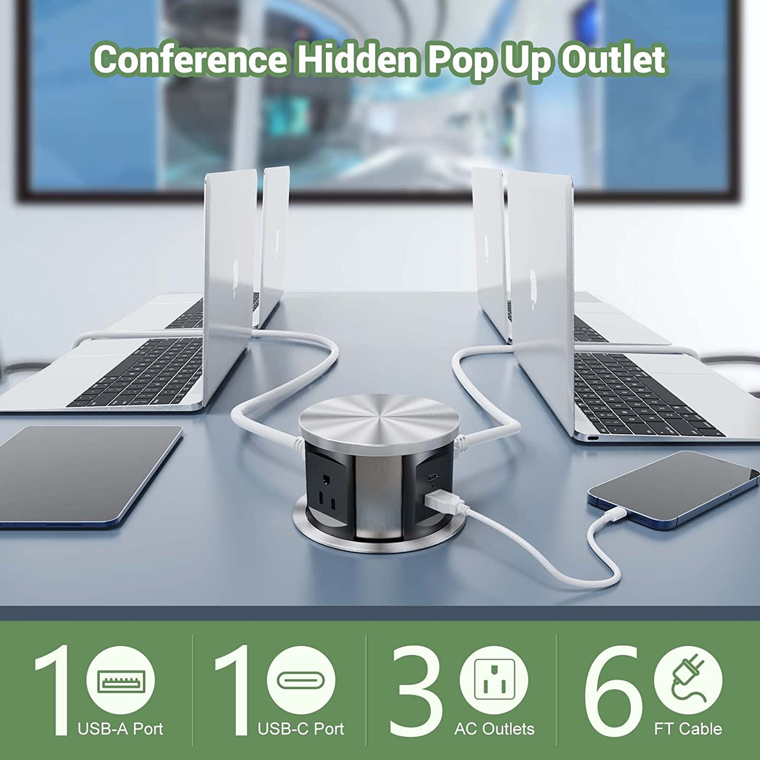 Pop Up Power Outlet Charging Station with 3 AC Plug & 1 USB A and 1 USB C Port