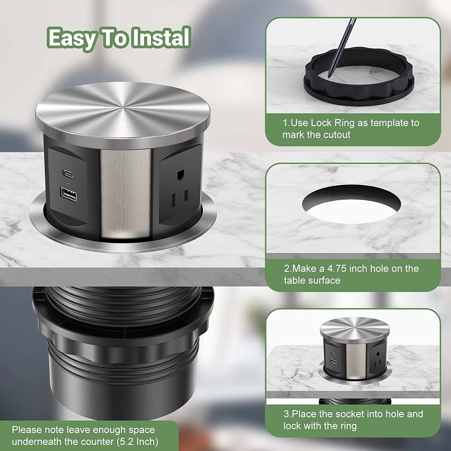 [ Easy To Install ] : Step1: Use Lock Ring as template to mark the cutout. Step 2: Make a 4.75 inch hole on the table surface. Step 3: Place the socket into hole and lock with the ring. Please note leave enough space underneath the counter (5.2 Inch).